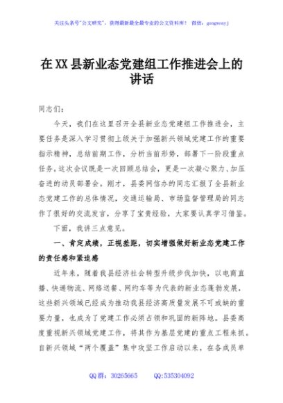 / 在XX县新业态党建组工作推进会上的讲话