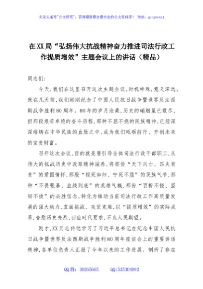 / 在XX局“弘扬伟大抗战精神奋力推进司法行政工作提质增效”主题会议上的讲话(精品)