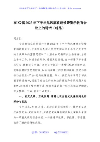 / 在XX镇2025年下半年党风廉政建设暨警示教育会议上的讲话(精品)