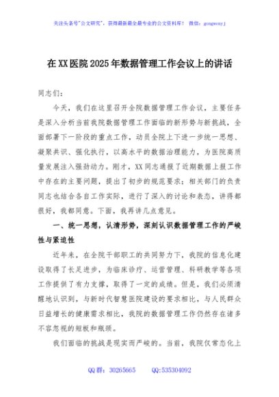 / 在XX医院2025年数据管理工作会议上的讲话
