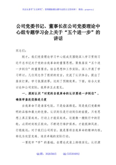 / 公司党委书记、董事长在公司党委理论中心组专题学习会上关于“五个进一步”的讲话