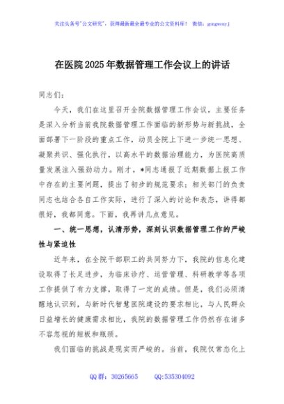 未生成预览图,长按二维码添加 在医院2025年数据管理工作会议上的讲话 - 公文研究