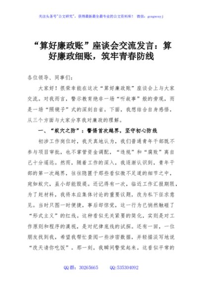 / “算好廉政账”座谈会交流发言:算好廉政细账,筑牢青春防线