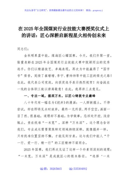 / 在2025年全国煤炭行业技能大赛授奖仪式上的讲话:匠心深耕启新程星火相传创未来