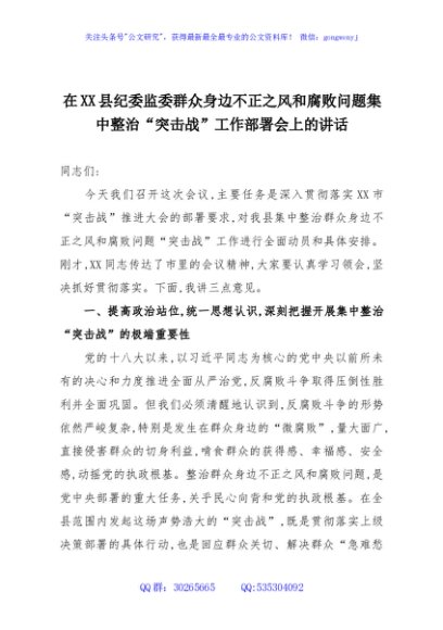 / 在XX县纪委监委群众身边不正之风和腐败问题集中整治“突击战”工作部署会上的讲话