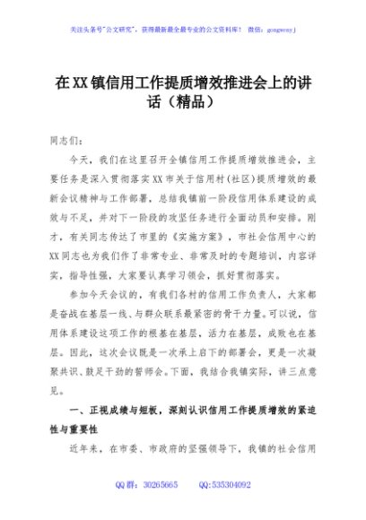 / 在XX镇信用工作提质增效推进会上的讲话(精品)