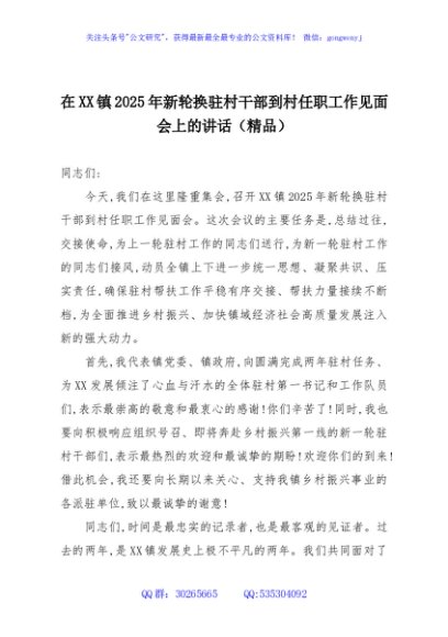 / 在XX镇2025年新轮换驻村干部到村任职工作见面会上的讲话(精品)