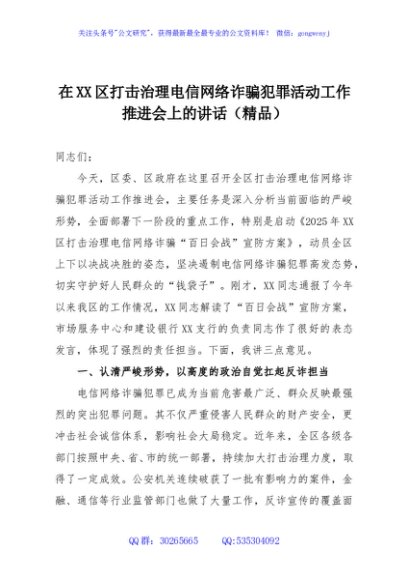 / 在XX区打击治理电信网络诈骗犯罪活动工作推进会上的讲话(精品)