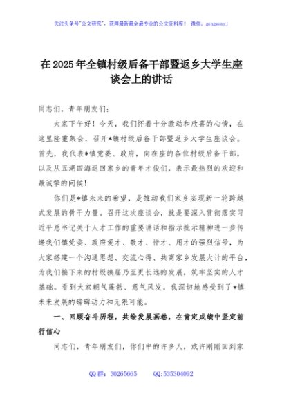 / 在2025年全镇村级后备干部暨返乡大学生座谈会上的讲话