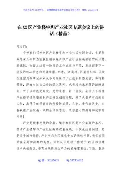 / 在XX区产业楼宇和产业社区专题会议上的讲话(精品)