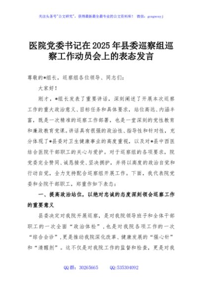 / 医院党委书记在2025年县委巡察组巡察工作动员会上的表态发言