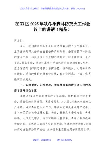 / 在XX区2025年秋冬季森林防灭火工作会议上的讲话(精品)