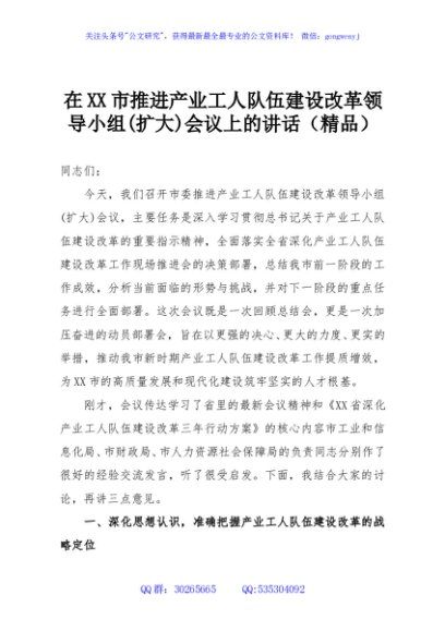 / 在XX市推进产业工人队伍建设改革领导小组(扩大)会议上的讲话(精品)