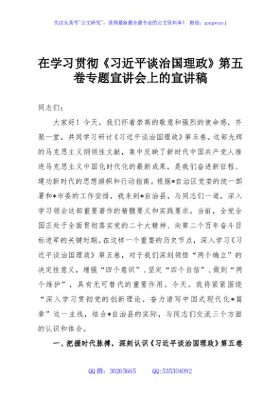 / 在学习贯彻《习近平谈治国理政》第五卷专题宣讲会上的宣讲稿