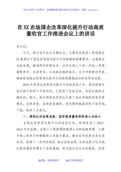 / 在XX农场国企改革深化提升行动高质量收官工作推进会议上的讲话