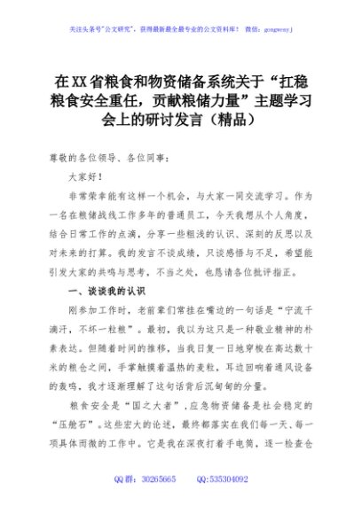/ 在XX省粮食和物资储备系统关于“扛稳粮食安全重任,贡献粮储力量”主题学习会上的研讨发言(精品)