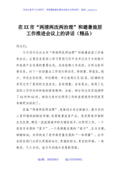 / 在XX市“两清两改两治理”和避暑旅居工作推进会议上的讲话(精品)