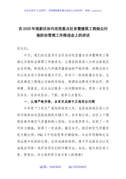 / 在2025年高新区治污攻坚重点任务暨建筑工程扬尘污染防治管理工作推进会上的讲话