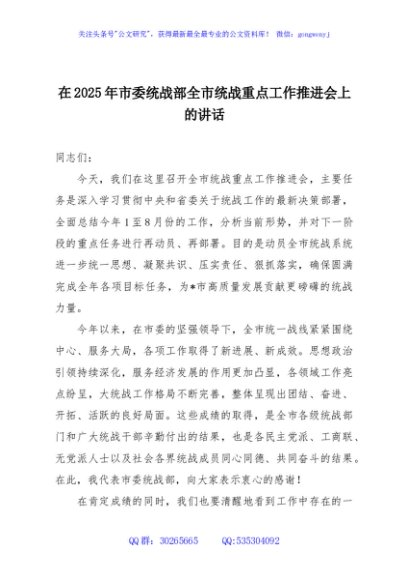 / 在2025年市委统战部全市统战重点工作推进会上的讲话