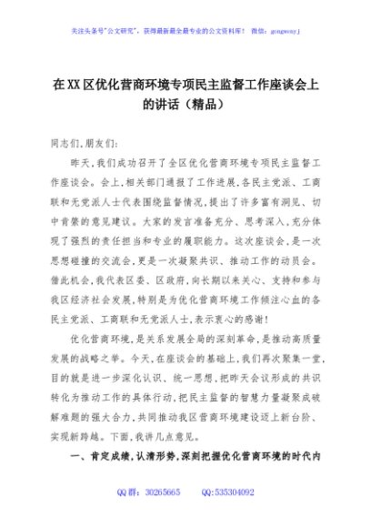 / 在XX区优化营商环境专项民主监督工作座谈会上的讲话(精品)