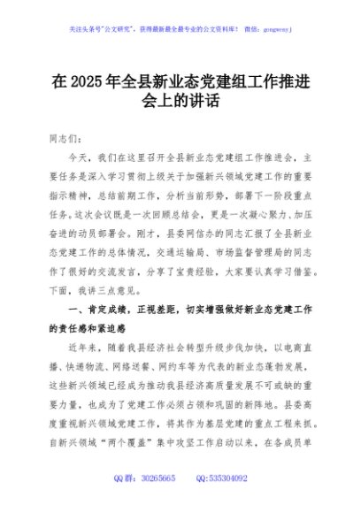 / 在2025年全县新业态党建组工作推进会上的讲话