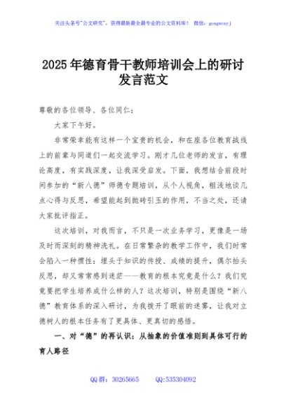 / 2025年德育骨干教师培训会上的研讨发言范文