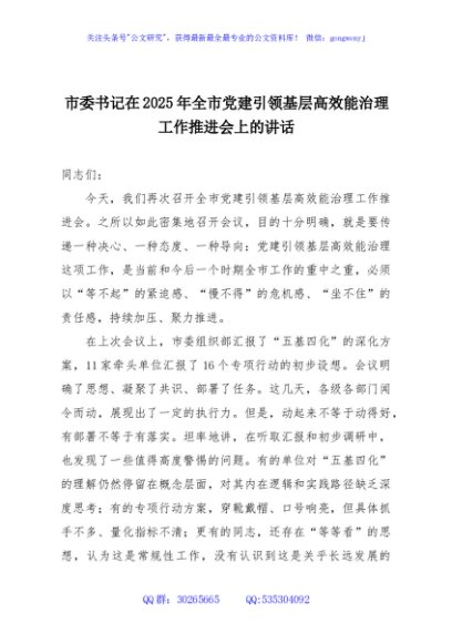 / 市委书记在2025年全市党建引领基层高效能治理工作推进会上的讲话