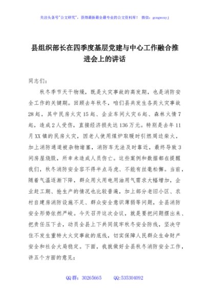 / 县组织部长在四季度基层党建与中心工作融合推进会上的讲话