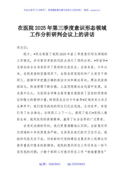 / 在医院2025年第三季度意识形态领域工作分析研判会议上的讲话