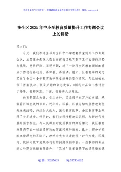 / 在全区2025年中小学教育质量提升工作专题会议上的讲话