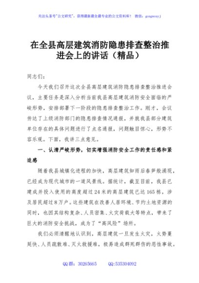 / 在全县高层建筑消防隐患排查整治推进会上的讲话(精品)