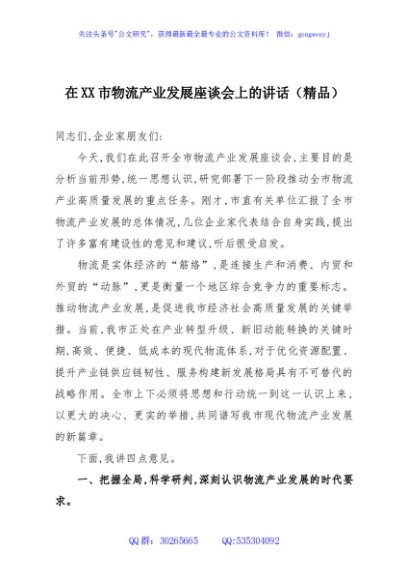 / 在XX市物流产业发展座谈会上的讲话(精品)