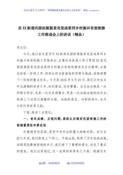/ 在XX街道巩固拓展脱贫攻坚成果同乡村振兴有效衔接工作推进会上的讲话(精品)