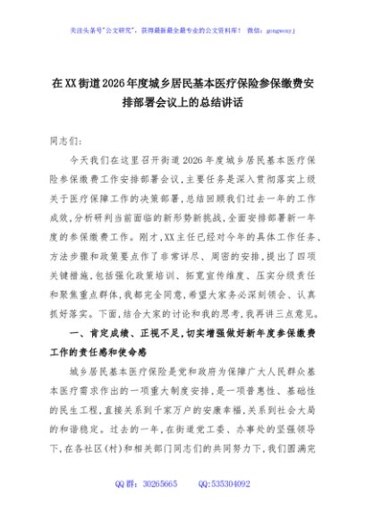 / 在XX街道2026年度城乡居民基本医疗保险参保缴费安排部署会议上的总结讲话