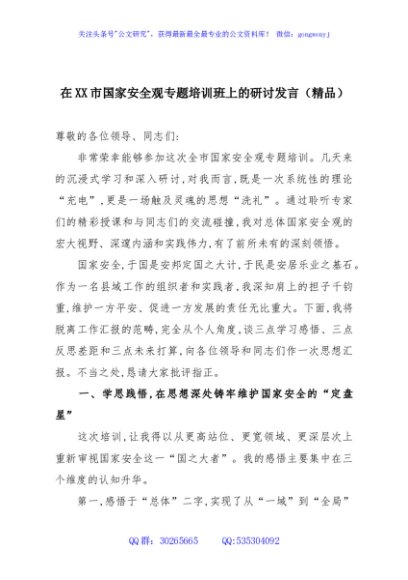 / 在XX市国家安全观专题培训班上的研讨发言(精品)