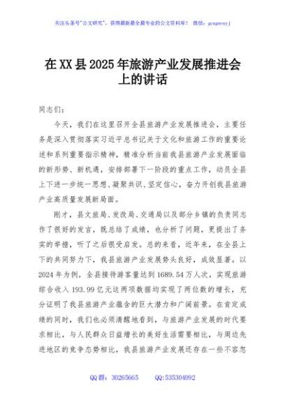 / 在XX县2025年旅游产业发展推进会上的讲话