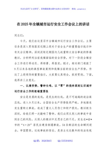 / 在2025年全镇城市运行安全工作会议上的讲话