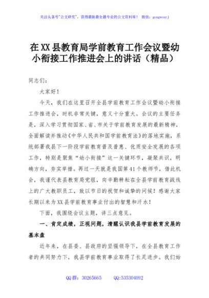 / 在XX县教育局学前教育工作会议暨幼小衔接工作推进会上的讲话(精品)