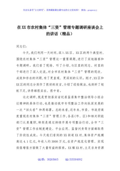 / 在XX市农村集体“三资”管理专题调研座谈会上的讲话(精品)