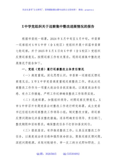 / X中学党组织关于巡察集中整改进展情况的报告