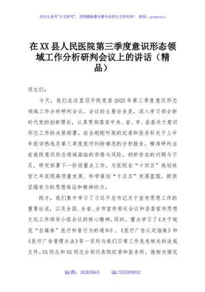 / 在XX县人民医院第三季度意识形态领域工作分析研判会议上的讲话(精品)