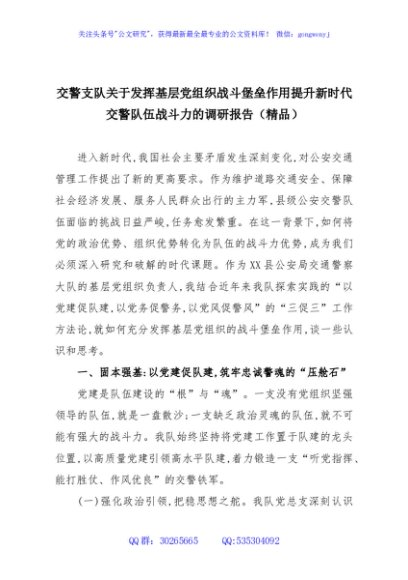 / 交警支队关于发挥基层党组织战斗堡垒作用提升新时代交警队伍战斗力的调研报告(精品)