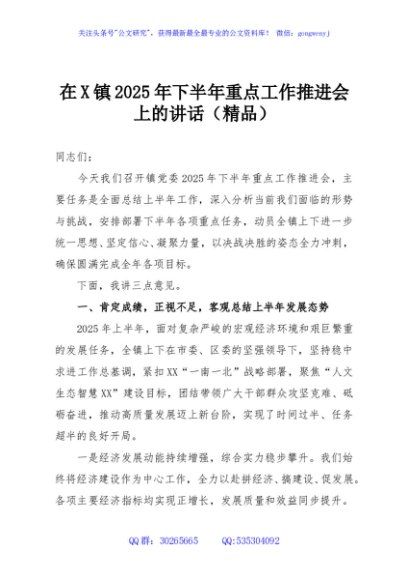 / 在X镇2025年下半年重点工作推进会上的讲话(精品)