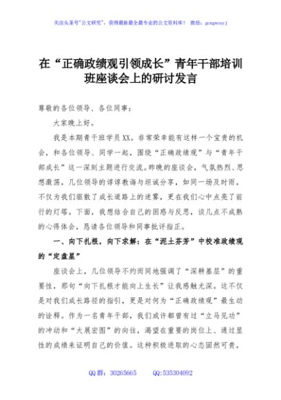 / 在“正确政绩观引领成长”青年干部培训班座谈会上的研讨发言