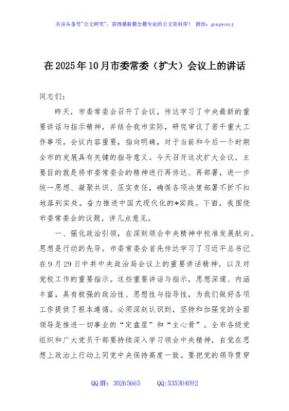 / 在2025年10月市委常委(扩大)会议上的讲话