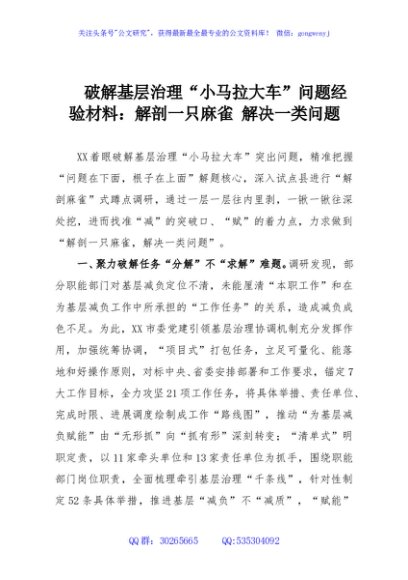 / 破解基层治理“小马拉大车”问题经验材料:解剖一只麻雀 解决一类问题