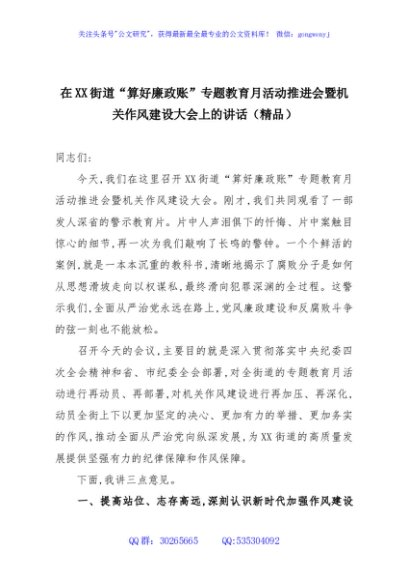 / 在XX街道“算好廉政账”专题教育月活动推进会暨机关作风建设大会上的讲话(精品)