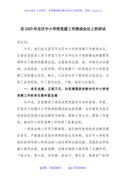 / 在2025年全区中小学校党建工作推进会议上的讲话