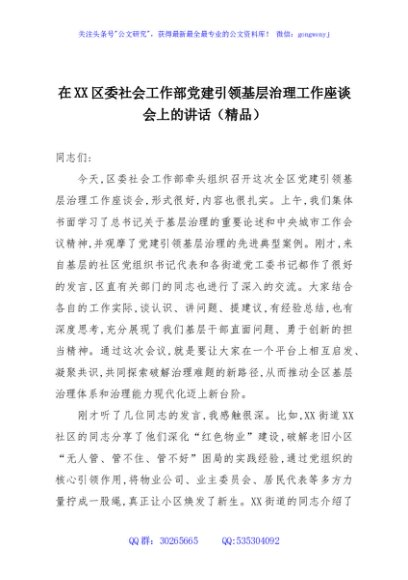 / 在XX区委社会工作部党建引领基层治理工作座谈会上的讲话(精品)