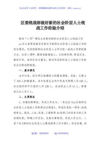 / 区委统战部做好新的社会阶层人士统战工作经验介绍